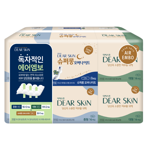 [깨끗한나라] 디어스킨 에어엠보 중형 16매 x 3팩 + 대형 14매 x 2팩 + 슈퍼롱 오버나이트 8매